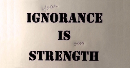 You may recognize IGNORANCE IS STRENGTH as one of the three slogans propagated by the secret Inner Party in Orwell’s novel 1984. The others were WAR IS PEACE and FREEDOM IS SLAVERY.